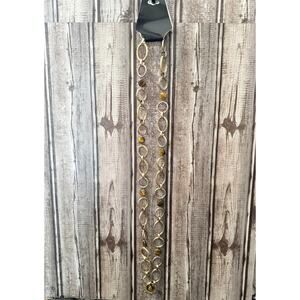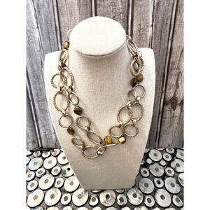 Enhance your style with this stunning vintage long necklace! It features beautiful tigers eye flat stones and silver oval circles links, creating a unique and eye-catching design. Some of the round links have a slight copper color, like the gold has worn off of it.