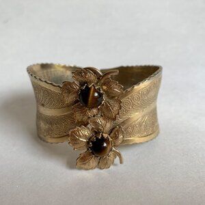 Vintage Tigerstone Gold Toned Clamp Cuff Bracelet Leaf Floral