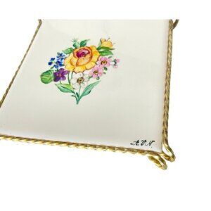 This pot holder is handpainted with floral decor and signed at the bottom AVN. The stand is made out of gold-tone twisted metal. Marked Made in Czechoslovakia. It has a handwritten note that reads: Souvenir from Austria, August 1973.