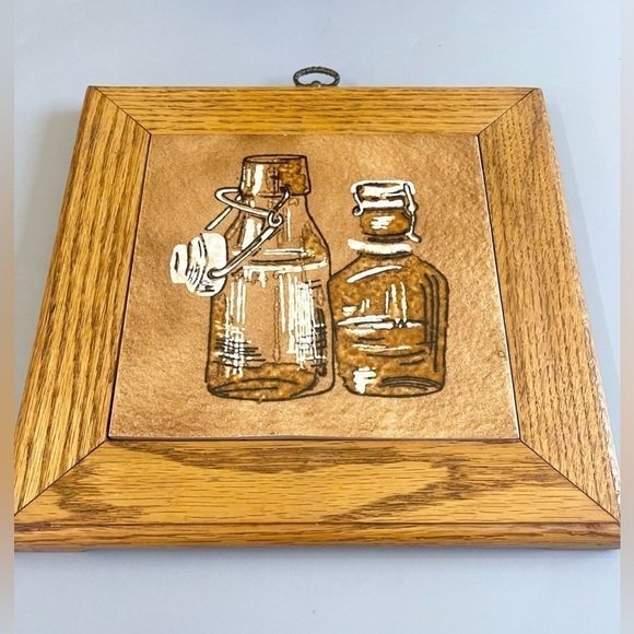 Vintage Tile Wall Decor Wood Frame 8x8” Ceramic Trivet Bottles Oil Vinegar Italy