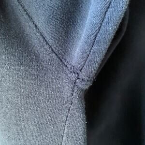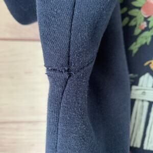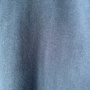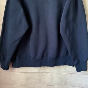 It has a ribbed crewneck, long sleeves with ribbed bands, and a ribbed band at the bottom. It is pre-owned with very light fading, pilling or fuzziness, and some cracking in the image. The armpit seams are pulled, slightly, and the image is not exactly centered on the front.