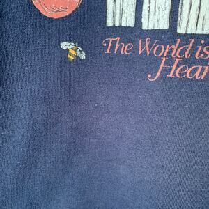 Vintage blue pullover graphic sweatshirt by Timber Creed. This sweatshirt has a stars and stripes birdhouse, a white picket fence, apples, birds, and a butterfly in the graphic. It says THE WORLD IS FULL OF BEAUTY WHEN THE HEART IS FULL OF LOVE!