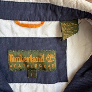 Description: This vintage Timberland Weathergear jacket is a classic piece of outerwear. Sized as a men's large, this full zip jacket features the timeless style of a Harrington with a bold logo on the chest. It's a perfect choice for a casual, rugged look and a testament to Timberland's reputation for durable apparel.
