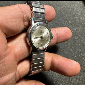 Vintage Timex Lady Classic Silver Tone Stretch Band Hand-Wind Mechanical Watch working shows signs of wear such as scratches on case band and crystal see pictures for reference