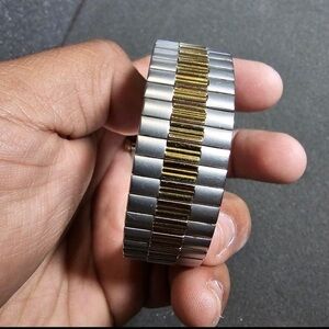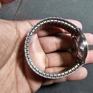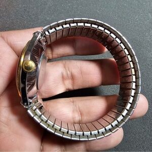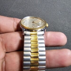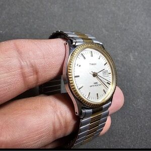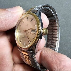 Vintage Timex Mechanical Wind Mens Watch Silver Gold Tone Date Just Working T 33 shows signs of wear see pictures for reference
