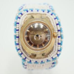 Pre-owned but in great condition! Absolutely stunning watch! The watch is currently running well when wound, but I do not have service records, nor have tested long term accuracy, but there seem to be no issues. The watch band is a homemade leather and bead strap in good condition with moderate discoloring/wear. The crystal is also in good condition with minimal wear. See pictures for measurements and more details.