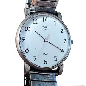 The Vintage Timex Quartz Watch features a classic design with a 32mm silver tone stainless steel case and matching stretch band. This 90s timepiece has a quartz movement, Arabic numeral indices, and a white dial with easy-to-read large numerals. With a durable stainless steel and brass construction, this watch is both stylish and reliable for casual everyday wear. It also includes features like water resistance and a seconds hand, making it a practical and timeless accessory for men looking for a vintage-inspired wristwatch.