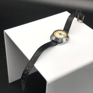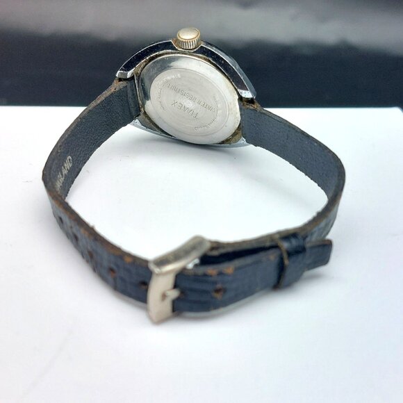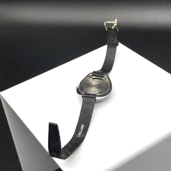 This working vintage Timex watch is a nostalgic piece, evoking the charm of yesteryears with its unique UFO-shaped case. Its mechanical movement and water resistance embody timeless quality. The aged dial and black leather band complement its distinctive design, making it a treasured item for collectors of vintage timepieces.