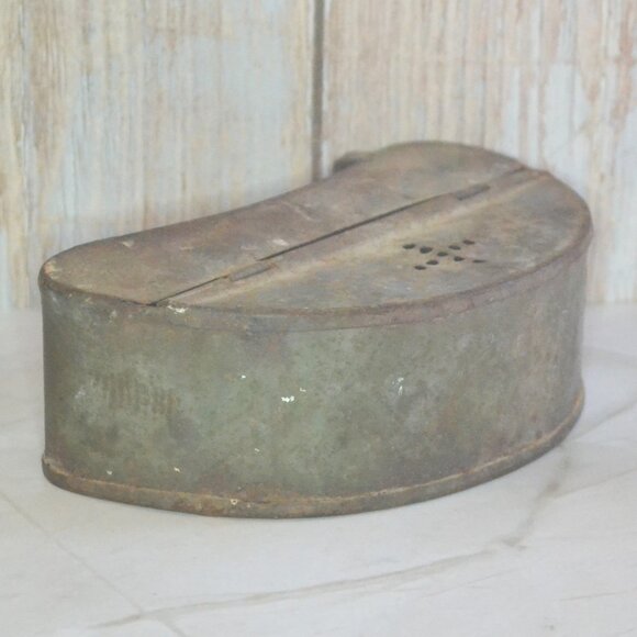 Vintage bait box made of tin. Has belt loops to attach to belt for easy hands free carry. Great piece to add to vintage fishing collection !