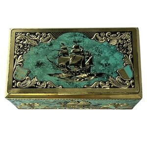 Vintage Tin Cigar Container Made In West Germany Ship Motif Green Teal Gold 8"L