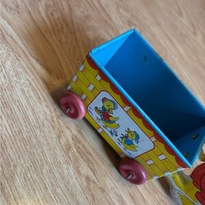 The tin's durable material is complemented by its unique design, featuring charming Easter bunnies and the craftsmanship expected from the J. Chein brand. With its original wooden wheels, this item is not only a visual treat but also a testament to the playful spirit of bygone Easter celebrations.