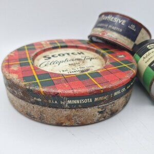 A charming collection of vintage tin containers, once housing Scotch tape, Ray adhesive bandages, Duro clear ribbon, and more. These empty tins are perfect for collectors or creative repurposing projects.