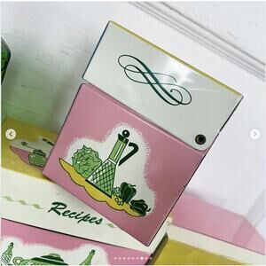 Sweet vintage Ohio Art Co. EMPTY metal recipe box in pink, green, yellow, and blue.