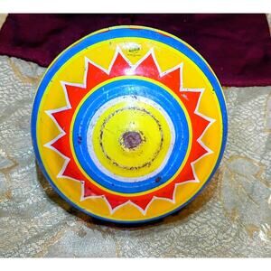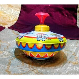 The Vintage Tin Spinning Top Toy by Ohio Art from the 1950s features a charming circus animal train design. Made in the United States, With its original vintage charm and classic design, this spinning top toy is a delightful addition to any toy collection. It has scuffs, scrapes, missing paint, just the normal wear and tear from its age and use. But it still looks cool for people who might collect vintage kid toys. This is sold as is to review the images before purchase