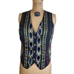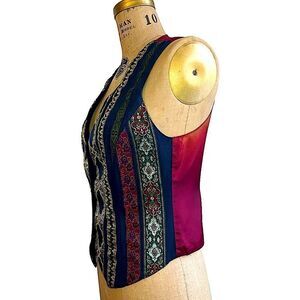 Vintage 90s Tina Hagen Rayon Wool blend blue, red and gold pointed vest waistcoat size Small Southwestern style brocade braided tapestry with cameo image distinctive oval gold tone buttons. Bust is darted for a shaped look. Back of vest is a deep red with adjustment strap. Wear it alone or over a cami, tank or shirt. Made in USA