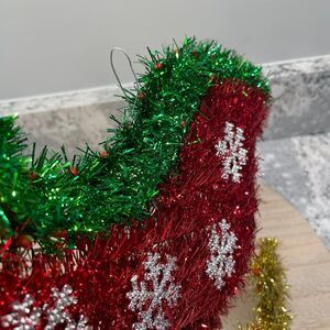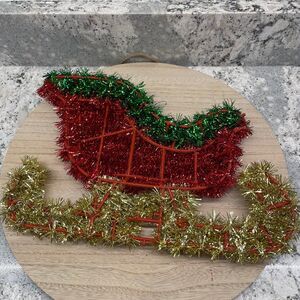 Plastic frame wrapped in gold, green and red tinsel in shape of a sled. See all images for full details. Ships in bubble mailer. Bin S