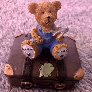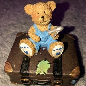 Adorable good condition little open/close box with a bear on top. Any scuffs listed. The insides are delicate but still work (as listed.) 4 inches tall.