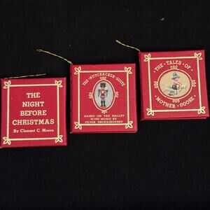 Vintage Set of 3 tiny book ornaments. The Tales of Mother Goose, the Nutcracker Suite and the Night Before Christmas.