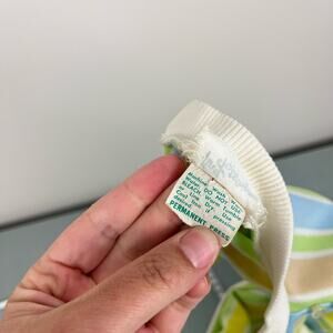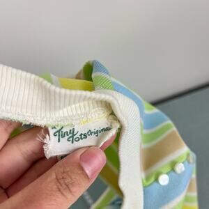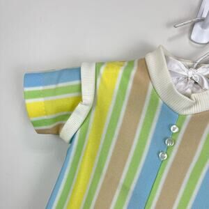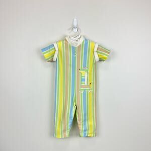 Vintage Tiny Tots Original Striped Giraffe Coverall. I don't see a size on the tag, so please check measurements to ensure fit. (Looks around a baby boy or girl size 12 months to me.) Amazing one piece 70s jumpsuit outfit with verticle yellow, green, white, tan, and blue stripes. Buttons in the back and snaps along the legs. Short sleeve top and long pants romper.