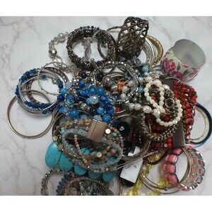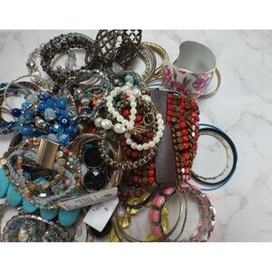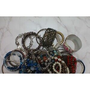 This vintage to now mixed lot of bracelets includes a variety of beaded, stretch, cuff, and bangle styles made from materials such as wood, plastic, and acrylic. The multicolor design adds a unique touch to each piece, making them versatile for any outfit. These bracelets are perfect for those who appreciate vintage jewelry and enjoy blending classic and modern styles in their fashion choices. Perfect for adding a pop of color and charm to any ensemble.