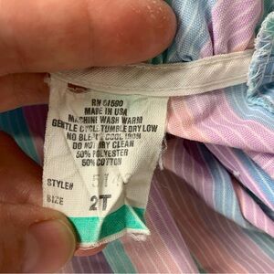 Vintage Baby Girl Rainbow Stripe Dress 2T Toddler Lace Buttons Ribbon Kawaii Bow. Measured flat. Armpit to Armpit is 11.5”, waist is 11”, shoulder to bottom hem is 16.75”. Two small holes on one arm. One tiny snag on back. Elastic in cuffs is no longer stretchy. Free of stains. In very good vintage condition.
