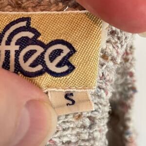 Good preowned condition, 55% silk, 30% acrylic, 15% wool, color is a taupe gray with multi color flecks, side button accents, deep arm holes