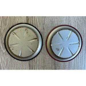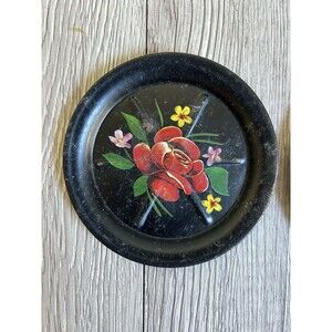 Vintage Tole Red & Black Hand Painted Coasters Ashtrays Metal Floral Set Of 2
