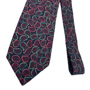Features: Men's long straight necktie, navy with burgundy and green paisley pattern