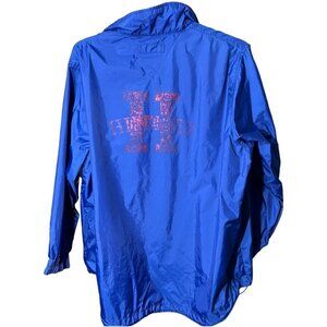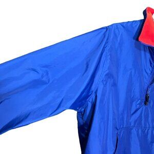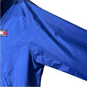 Elevate your style with this vintage Tommy Hilfiger 1/4 zip windbreaker in a bold blue color. This mid-length jacket is perfect for travel, casual outings, and workwear. The jacket features a softshell fabric type with a solid pattern and a Tommy Hilfiger logo accent. The windbreaker has a regular fit and comes in size XL.