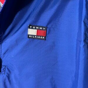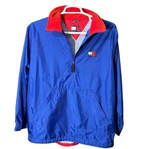 Vintage Tommy Hilfiger 1/4 Zip Windbreaker Patched Logo Blue Pullover Size XL