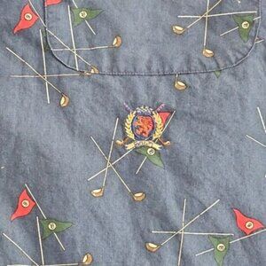 Embrace timeless style with the Vintage Tommy Hilfiger AOP Golf Shirt. Designed for the discerning gentleman, this men's large button-up boasts a classic blue hue complemented by a vibrant Golf Flag pattern, making it an ideal choice for both business and casual occasions. The long sleeves and collared neckline provide a polished look, perfect for the office or a weekend outing. Crafted from soft, woven cotton, this shirt ensures comfort and durability.