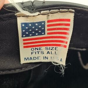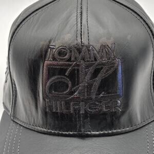 Vintage Tommy Hilfiger black leather baseball cap with all-black embroidered logo on front and TH on each side. One size fits all with adjustable strapback. Made in USA, likely early 90s. Clean stitching, soft leather, and minimal wear. Very nice condition!