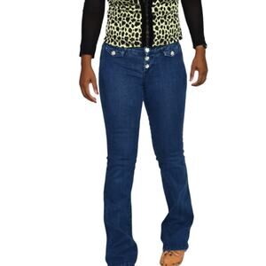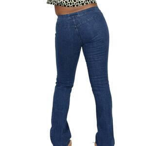 Vintage Y2K Tommy Hilfiger jeans FEATURE a front rhinestone bling button fly closure. Medium wash. Faux front pockets. Bareback. Some stretch. Shiny jeweled rhinestone button closure. Flare pant legs.
