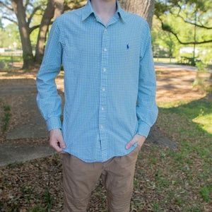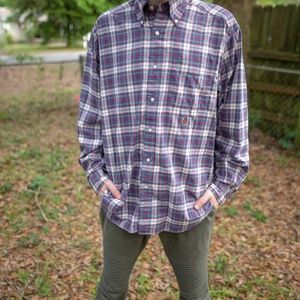 Vintage Tommy Hilfiger Plaid Button Down with embroidered Crest Logo. It's an older fit, so it fits bigger like a Large.