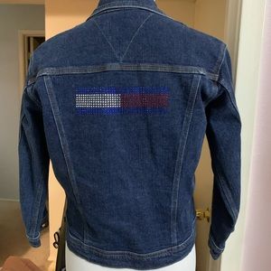 This is a Vintage Tommy Hilfiger Denim Cropped Jacket 3/4 Sleeve with Rhinestones on the back all intact.