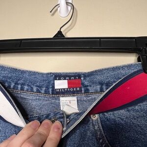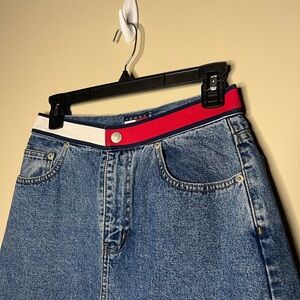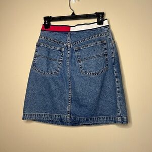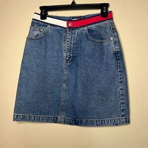 Vintage 100% cotton Tommy jeans denim skirt. Waistband is red and white to reflect the Tommy logo. Size six. Small stain at bottom left as pictured.