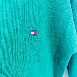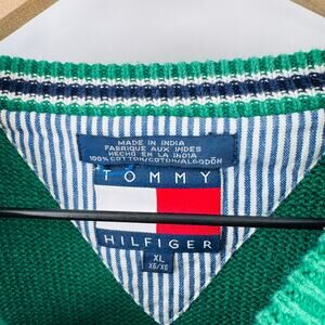 tommy hilfiger sweater, vintage tommy, oversized sweater, unisex sweater, preppy style, 90s fashion, Y2K style, green knit, flag logo, classic fit, cotton knit, cozy sweater, varsity style, streetwear, retro clothing