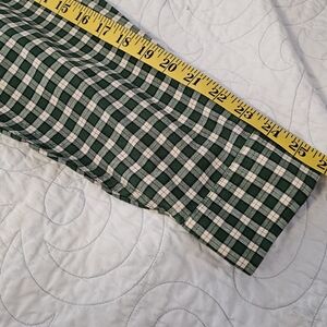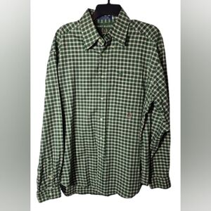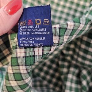 Cream and green Plaid, good used condition, has the Tommy Hilfiger crest with Corduroy triangle neck label. Long Sleeve Button Down casual shirt.