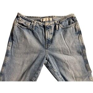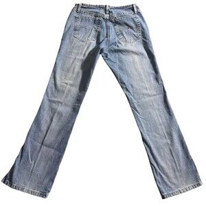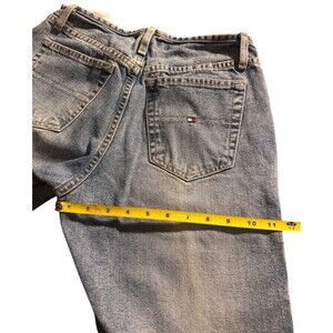 Vintage Tommy Hilfiger jeans in size 4 (27" waist, 30.5" inseam), featuring a slim fit, flared leg, and mid-rise. Made of 100% cotton denim with a medium wash, they have a zip and snap closure, logo accents, and pockets. These Y2K-era jeans have a retro, hipster, bohemian vibe, perfect for all seasons.