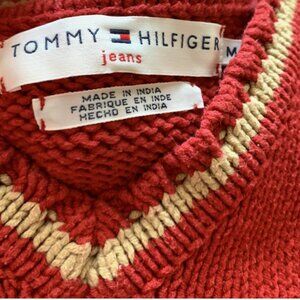 Featuring a classic red V-neckline with tan trim accents, this piece captures that iconic 90s preppy look Hilfiger is known for.