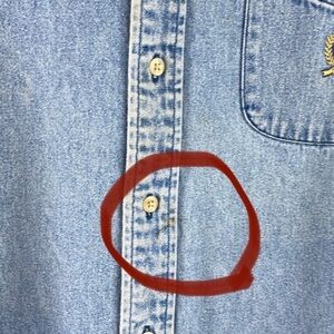 Vintage 2000s light wash denim button down shirt. Fading at the collar and one stain on the front by a button - see photos. Very good preowned condition. No holes. Please review photos closely and ask any questions before purchasing. Comes from a smoke free, pet free home. Please review photos for measurements and verification of condition. Color may vary slightly due to lighting.