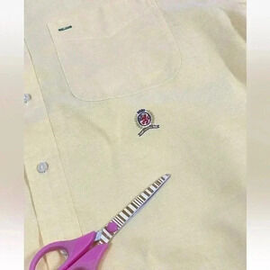 This vintage Tommy Hilfiger men's button-down shirt in a sunny yellow color is perfect for a variety of occasions, from casual to formal. Made of 100% cotton, it features a button collar and long sleeves with button cuffs. The shirt also includes practical pockets and is machine washable for easy care. The embroidered Tommy Hilfiger logo adds a touch of style, and the shirt's solid pattern and classic theme make it a timeless piece. Whether you're going to a wedding, a party, or just out for a day of travel, this shirt is sure to impress.