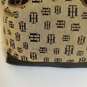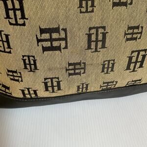 Authentic vintage Tommy Hilfiger tote bag with all-over TH monogram print in beige canvas and black leather trim. Features double handles, top zipper closure, and a roomy interior with multiple compartments and signature blue lining. A true Y2K classic from the late 1990s/early 2000s, perfect for collectors and retro fashion lovers.