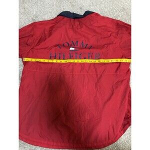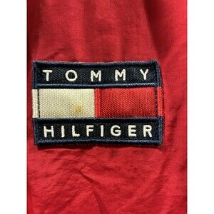 Vintage Tommy Hilfiger red sailing-style jacket in Mens XL the exact bold primary-color era everyone is hunting this season. Red nylon shell, contrast yellow/navy lining, oversized embroidered flag patch, branded zipper pull, and big spell-out logo across the back. Total 90s hip-hop / Y2K prep nostalgia piece.