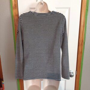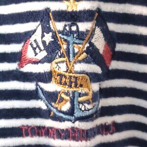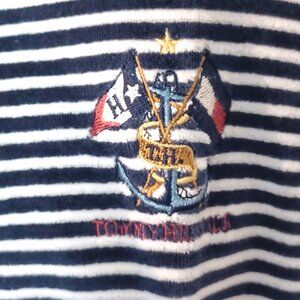 Vintage Tommy Hilfiger shirt has embroidered logo on the sleeve. Get your cool 90s vibe. Terry cloth shirt is very soft. It has long sleeves. It is blue and white striped. It is size medium.