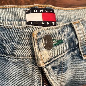 Vintage Tommy Hilfiger Tommy Jeans Blue Distressed Denim Shorts, size 5-vintage sizing; refer to approximate measurements for desired fit. Please note: has signs of wear and fading.