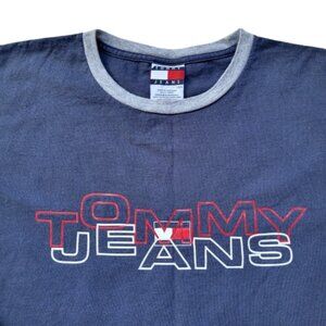 Authentic vintage Tommy Jeans long sleeve shirt in navy blue. Features a bold red and white TOMMY JEANS logo across the chest and down the sleeve for classic 90s streetwear vibes. Contrast gray crewneck adds the perfect retro touch.