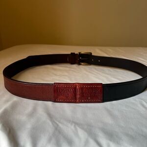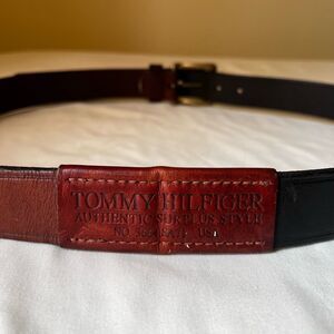 Vintage Tommy Hilfiger belt, two-tone brown black leather belt, Y2K preppy surplus belt, 2000s Hilfiger menswear, brass roller buckle belt, retro designer accessory, authentic surplus style, casual streetwear belt, men's waist belt size 38, heritage fashion belt, black brown leather combo, Hilfiger vintage Y2K, classic preppy style, men's casual jean belt