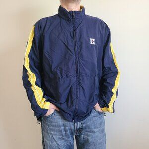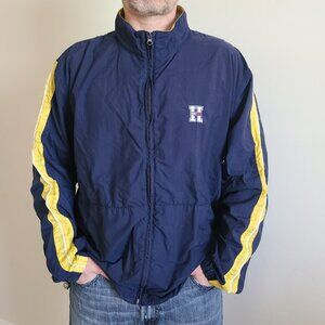 Classic 90s Tommy Hilfiger windbreaker in navy with yellow stripe detailing.