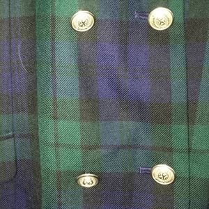 Green and navy blue plaid dress with gold tone buttons.